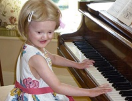 an image of Tess with blonde hair wearing a white and pink summer dress playing the piano
