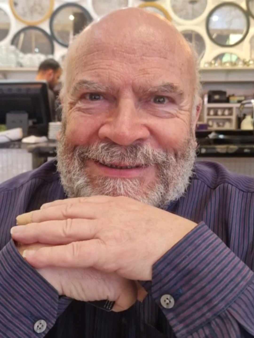 image of rachaels dad, who is bald, has a grey beard and is resting his chin on his hands looking into the camera