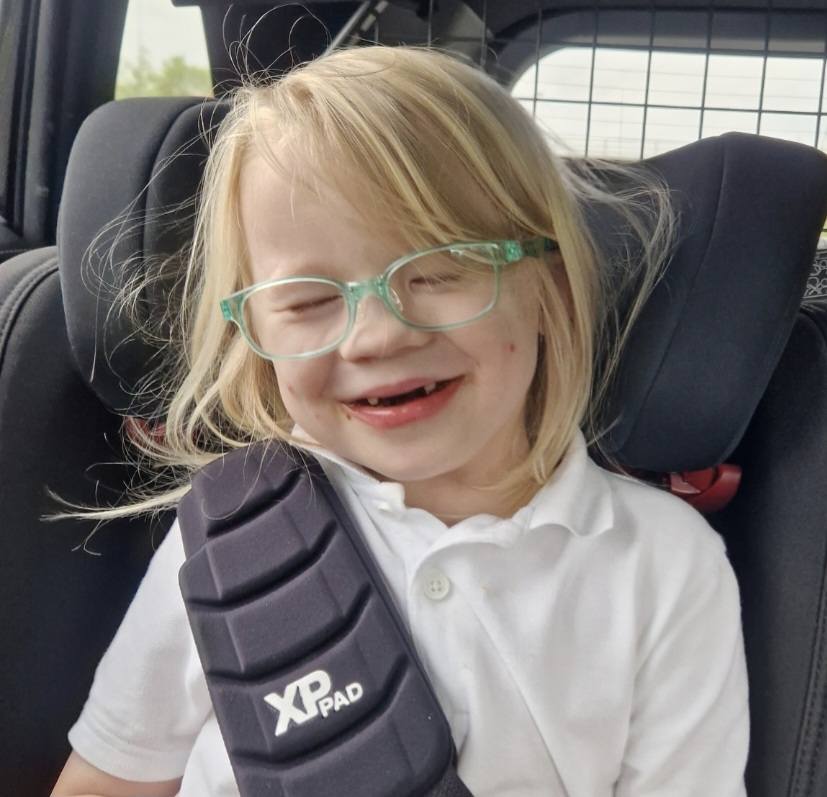 an image of Alice Dyke in her car seat in the car. She has blonde shoulder length hair and is wearing green glasses